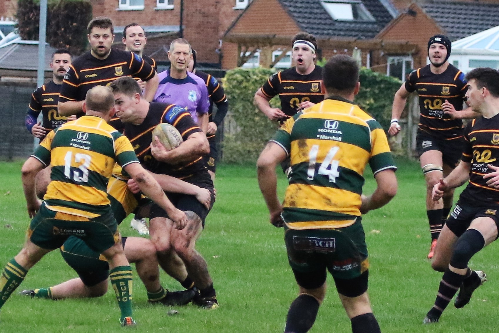 Harrogate Pythons visited Northallerton and managed to cling on to their top position with a bonus point win. Quickly into the action, the visitors showed their phase play with Jon Pickard and Steve Smith gaining hard yards before centre Tim Evans crashes over on 3 minutes Jed Carr adds the extras. James Audsley-Beck’s quick thinking at a tap penalty puts Jack Hall into space with Evans waiting outside to cross the line once again. But the referee penalised Evans for jumping through a tackle. Northallerton clear to their 10m line but are penalised at the line out.