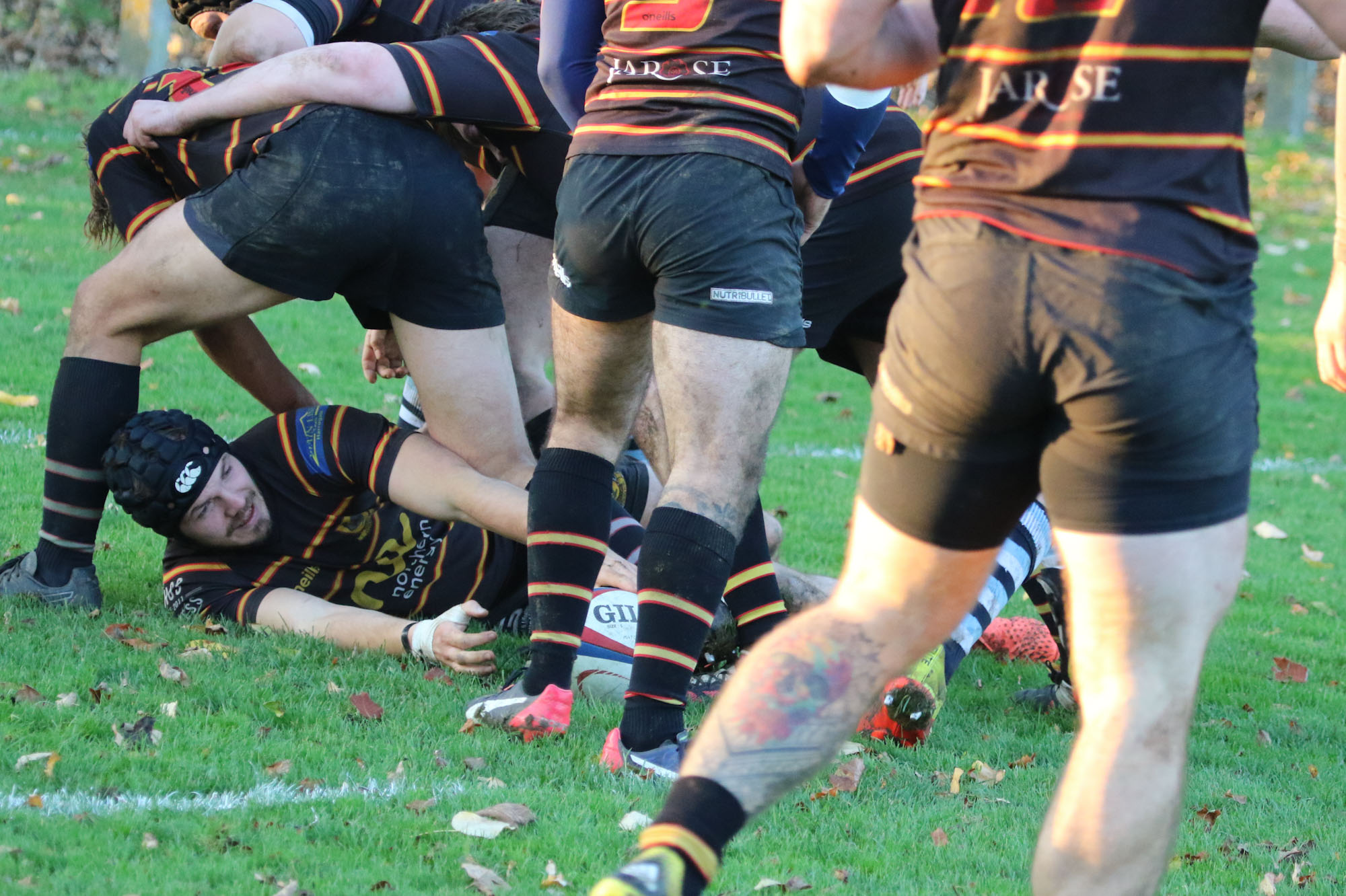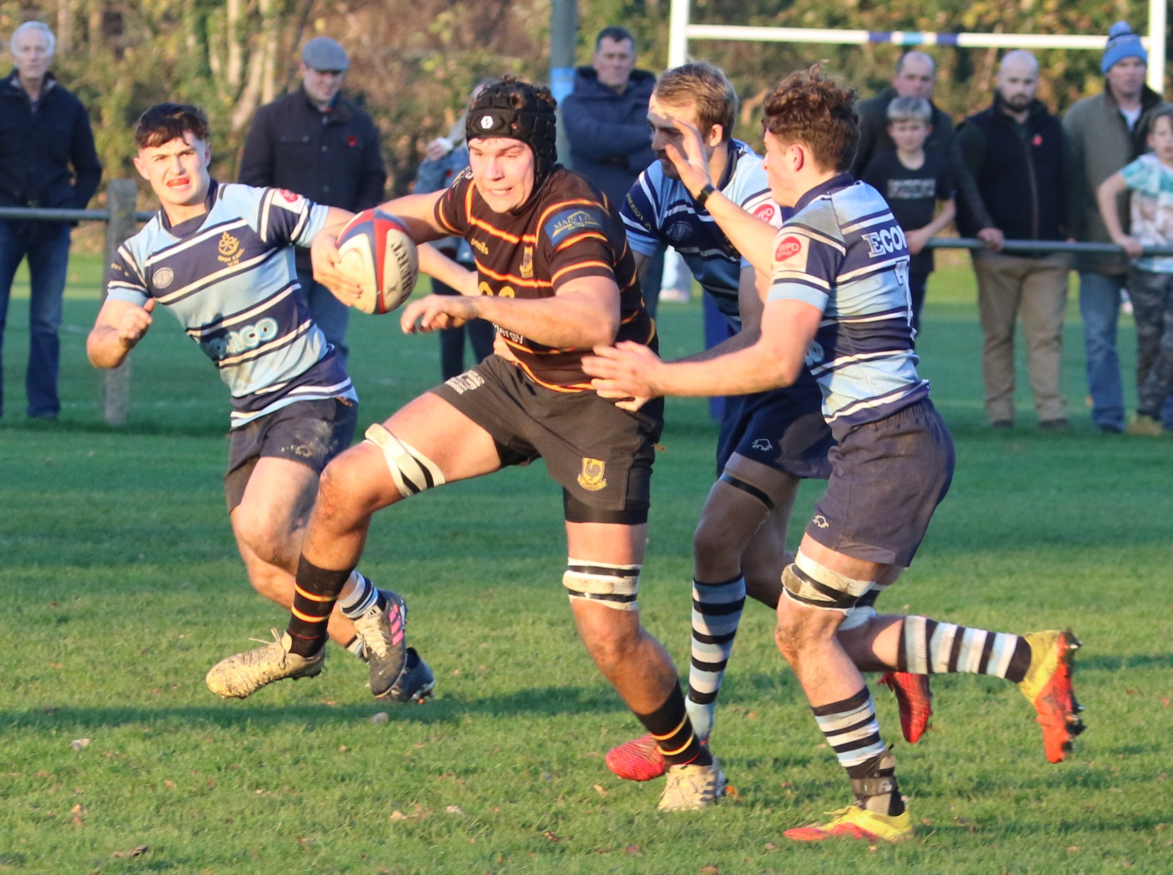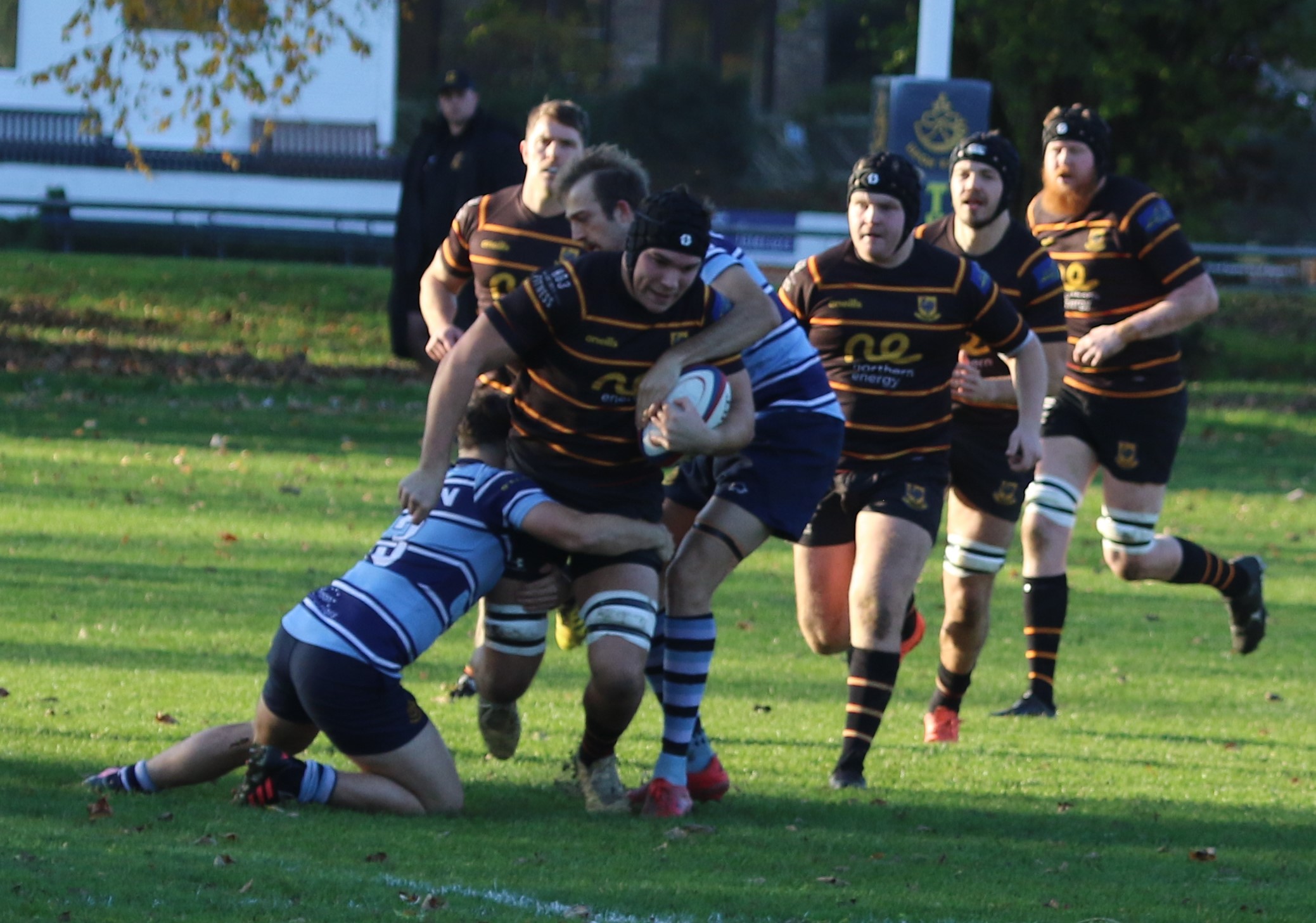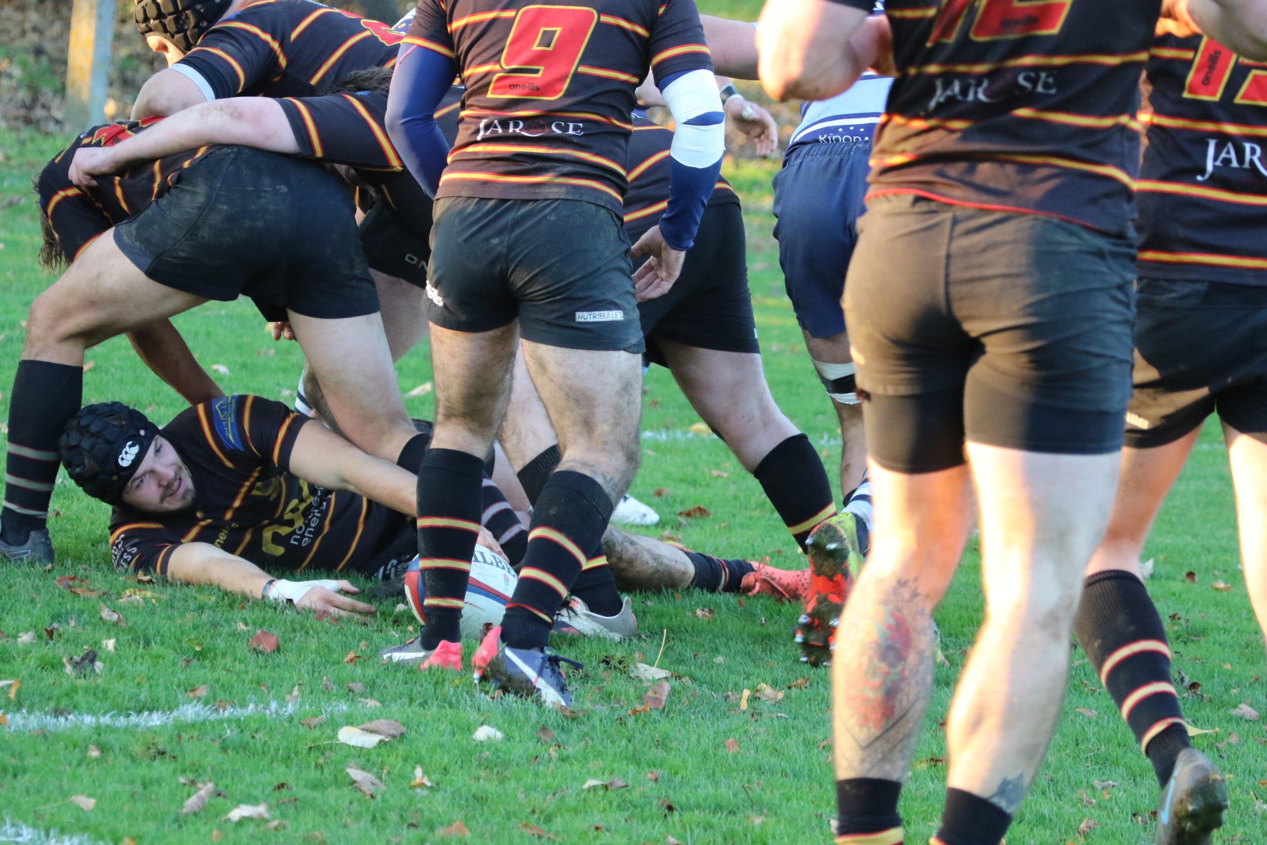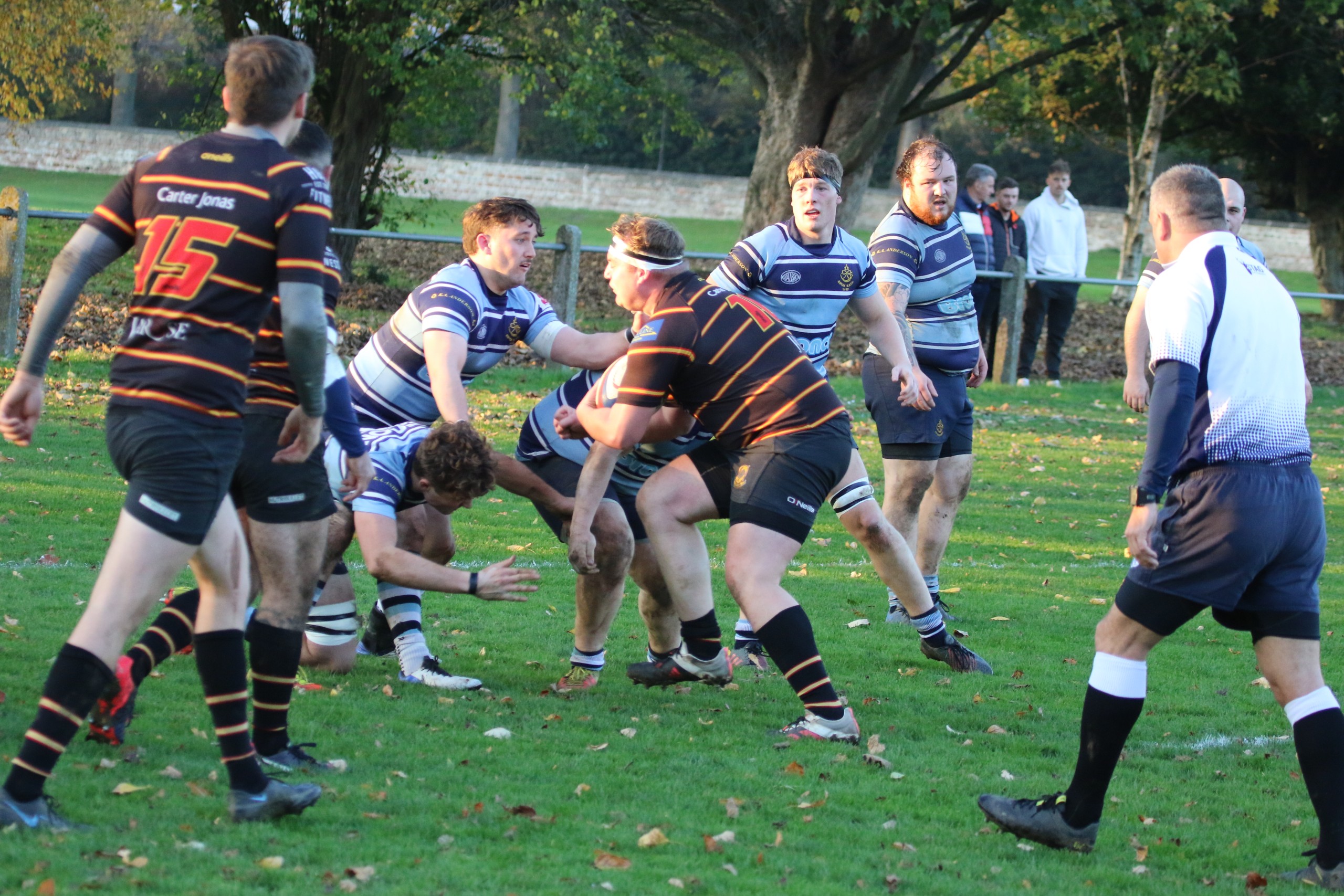 A perfect autumnal afternoon for rugby, The Pythons are quick into their plays keeping the home side pinned down in their own half. The Pythons driving game was met with some stern defence but perseverance kept captain Will Butler and his forwards pressuring the line. Frustrating penalties gave the home side the opportunity to clear their lines on a number of occasions but Joe Bentham and James Audsley-Beck’s pace keep the game in the home side’s half. Jack Hall and Hugh Tatlow piled the pressure on close to the breakdowns and Marcus Fotherby’s dominance in the line out kept the attacks pressurising the line. A rare foray into The Python’s half gives the home side a shot at goal, 3-0 on 20 mins.