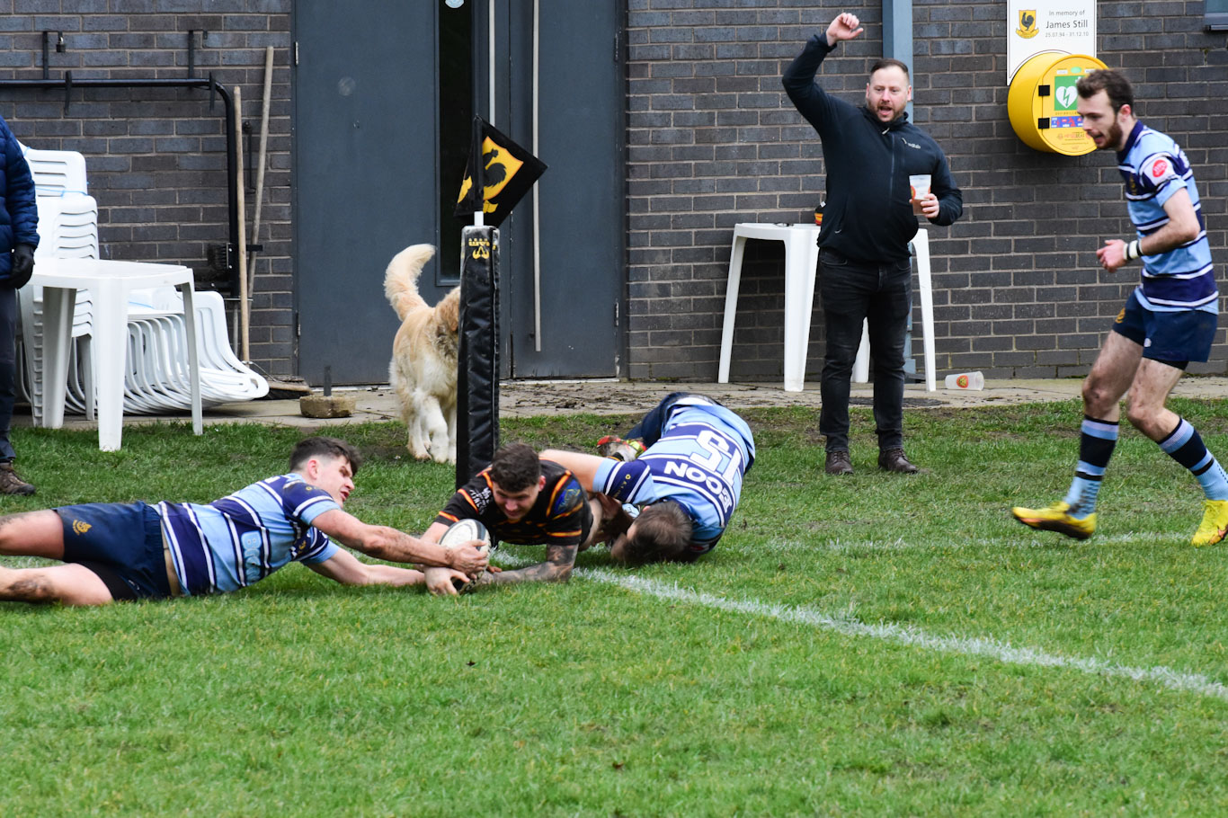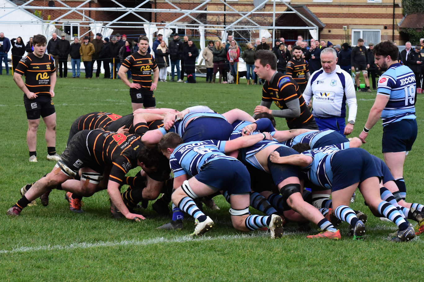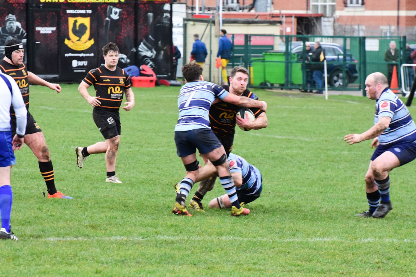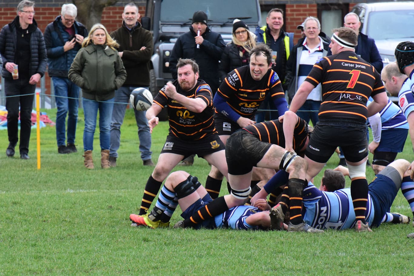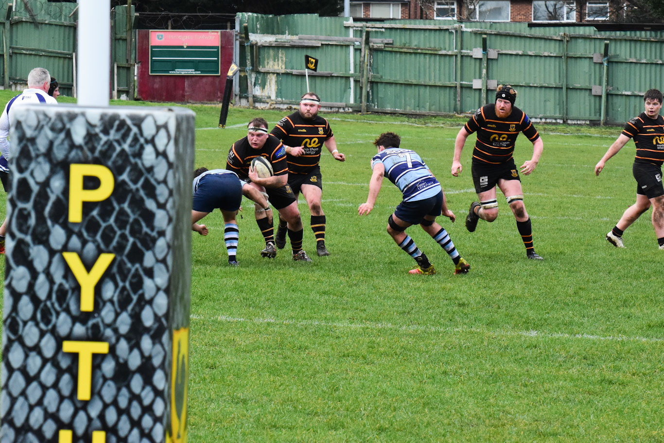 The largest crowd of the season so far gathered at The JSG. Bolstered by a former players’ lunch the crowd enjoyed a hard fought game with both sides leaving everything on the pitch. Early exchanges were even with the home sides’ runners testing the Ripon defence. Tim Evans and Jack Hall carried hard into the away teams territory. Pythons scrum 10m following a not straight at their line out and Hugh Tatlow picks and feeds Liam Kernaghan only to be held on the line. Ripon clear their lines but James Audsley-Beck returns with a deft kick ahead, gathered by Jed Carr and Ripon are penalised for not releasing in the tackle. Carr puts The Pythons ahead 3-0.