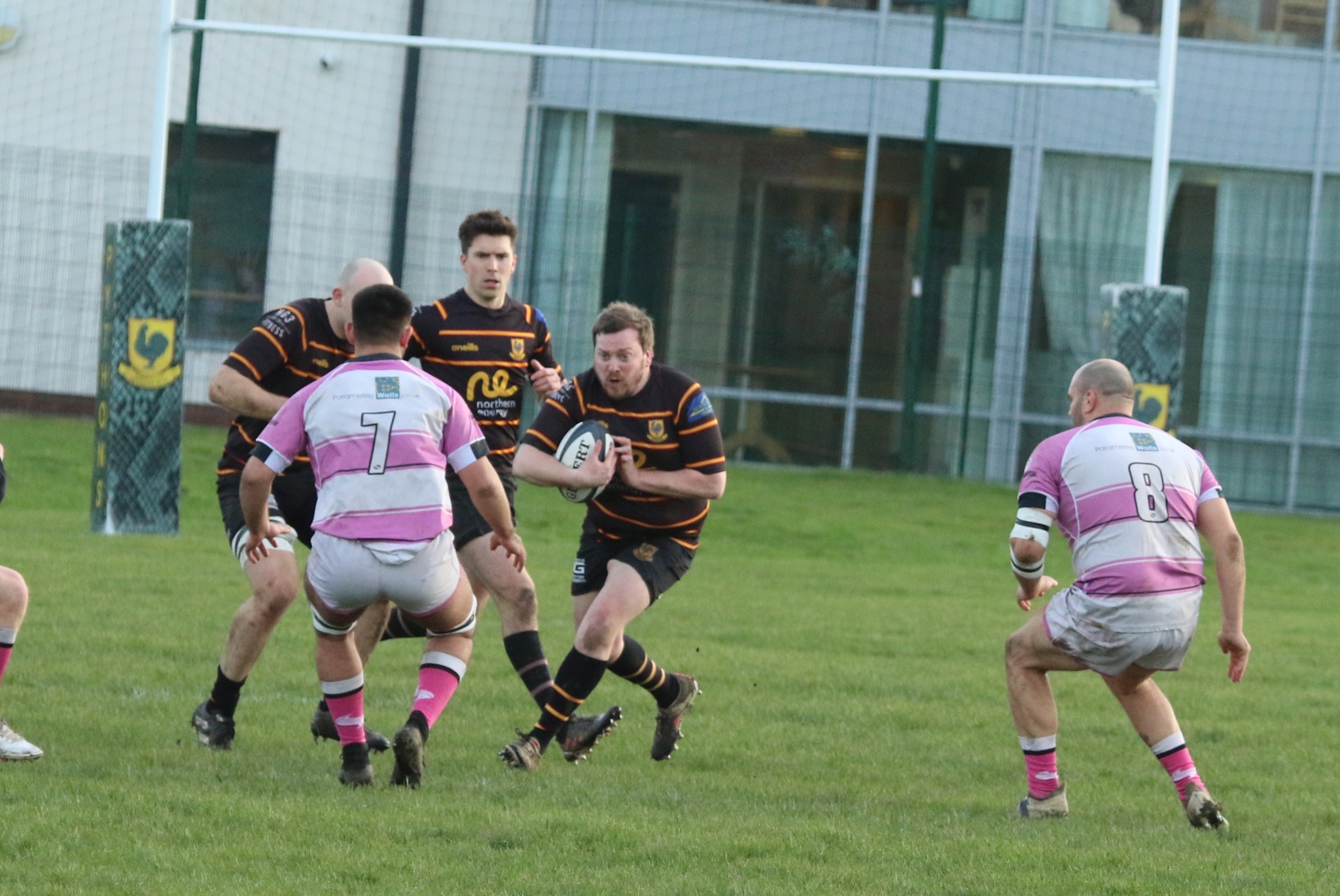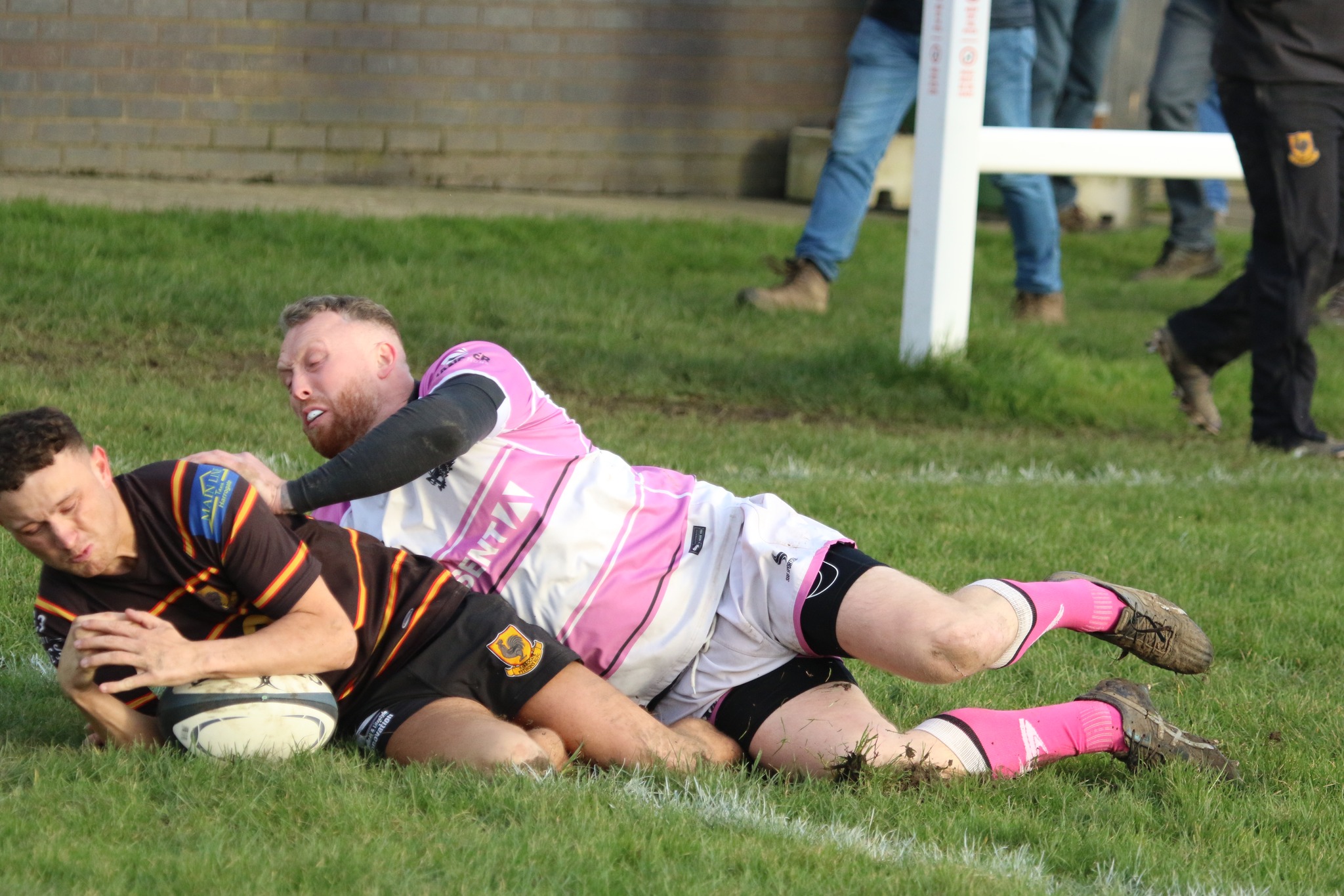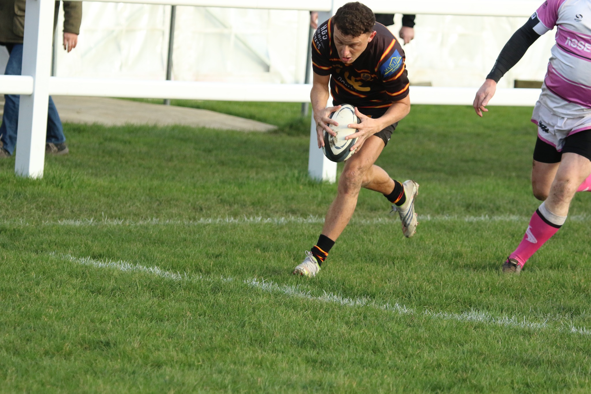 The Pythons showed greater intent in the first 20 minutes. Determined carries from Pete Millward, Hugh Tatlow and Tim Evans put the away side on the defensive. From a scrum on half way Ed Challis picked up from number 8, fed to Mike Adams who showed quick hands to Max Sharp who slotted a perfectly weighted grubber kick for Nick Bell to collect, outpace the defence to score in the corner, Jed Carr with the extras 7-0 on 5 mins. The Pythons kept up the pressure with Challis, Evans, Tatlow and Sam Rowntree all halted just short of the line.