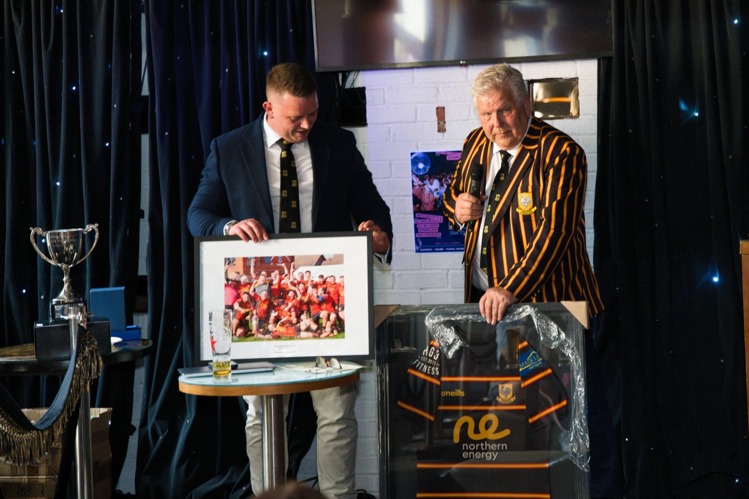 In addition to his Clubman Award Dan was presented with a card from his son Will, a framed shirt, a framed photo of the 22/23 promotion squad, and engraved tankards, a club shield and is the first recipient of the club’s prestigious ‘red’ tie.