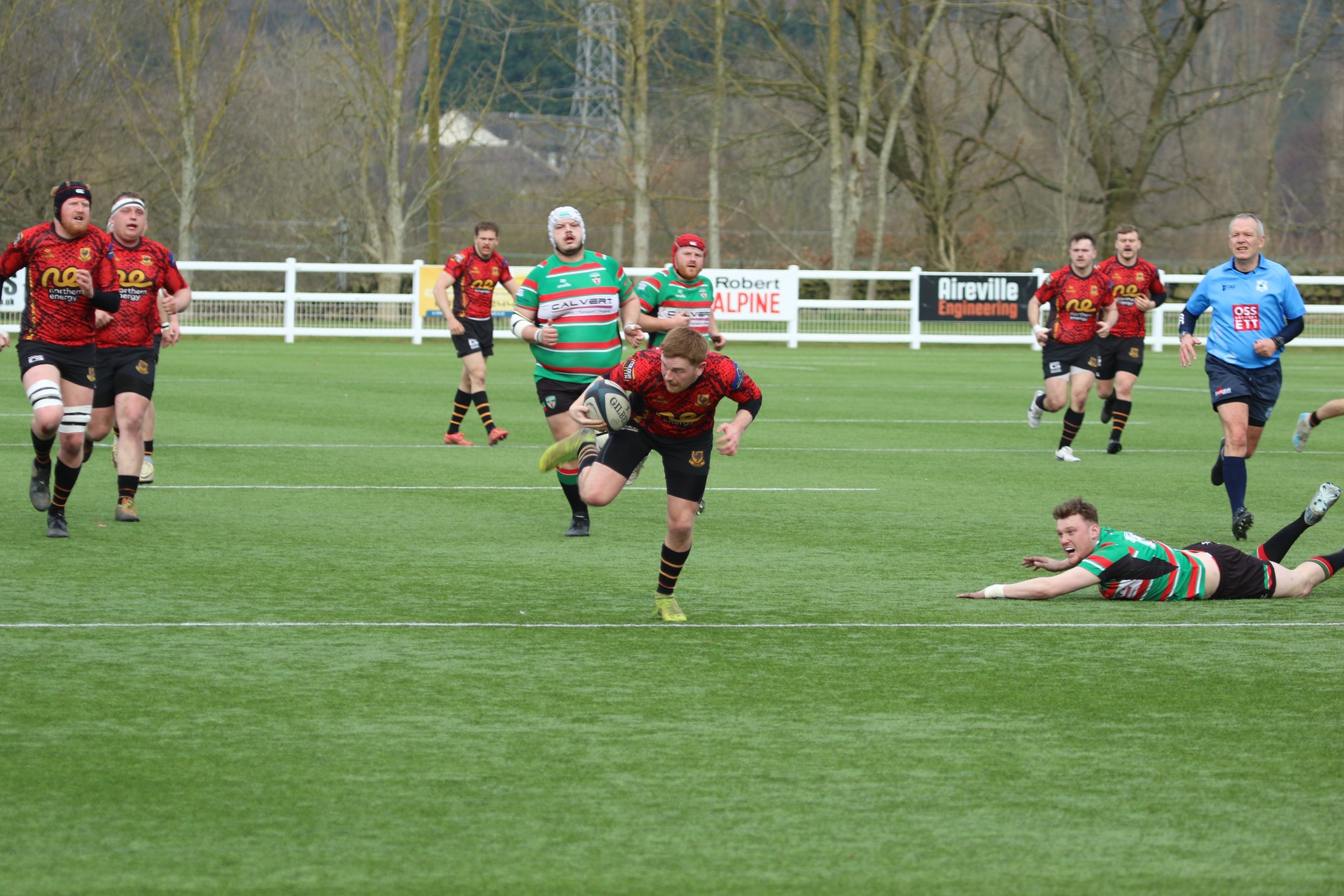 The game is then halted for 10 minutes whilst the referee has treatment following a collision with a home player. Luckily he’s fit to continue. The home side pile the pressure on through the mid field but knock the ball forward. Against the run of play, the home side win the ball against the head and crash over in the corner, 12-7 on 30mins. Tatlow is forced to leave the field for a pitch related injury and is replaced by his younger brother Fergus making his 1st team debut.